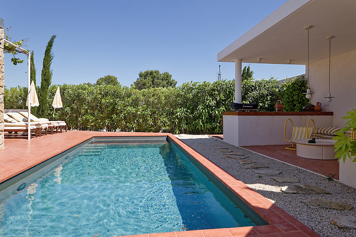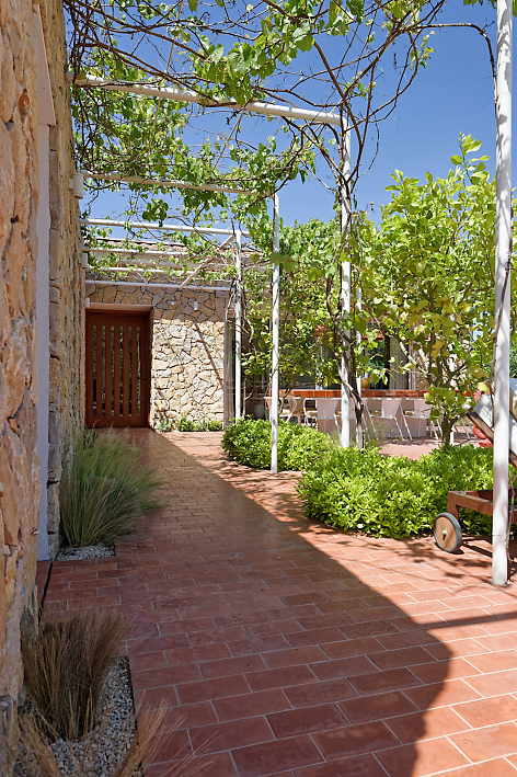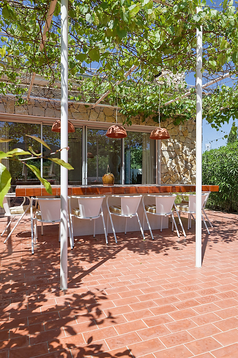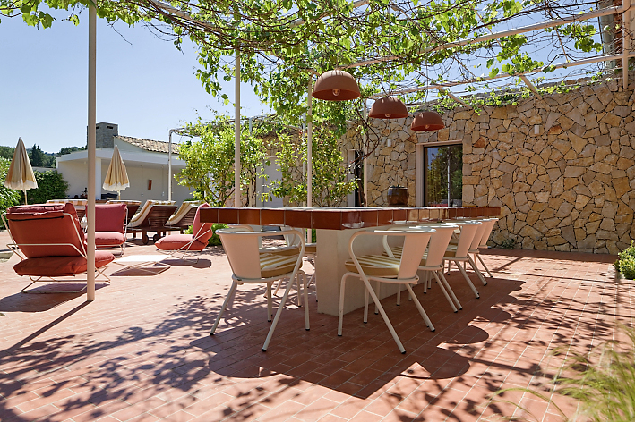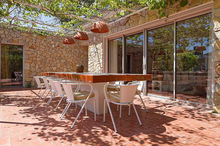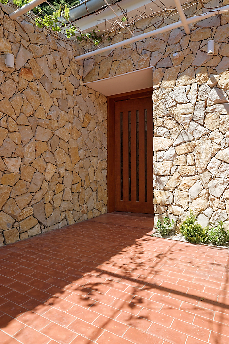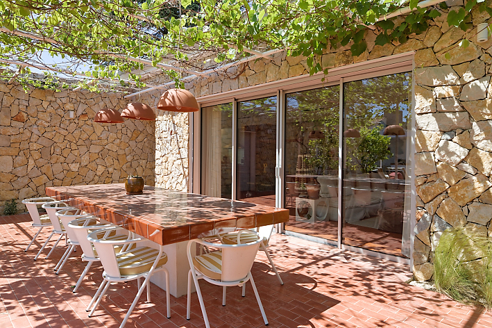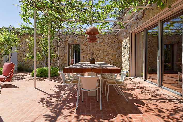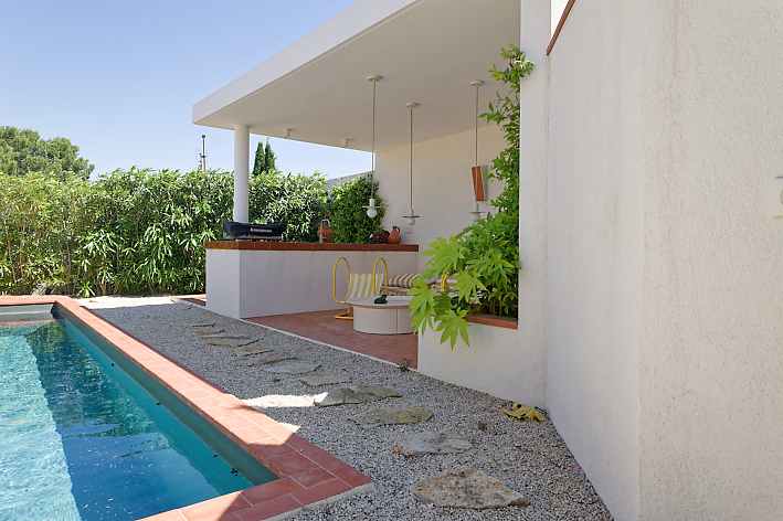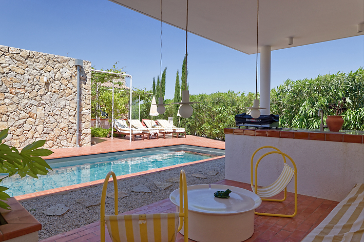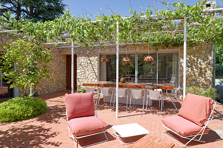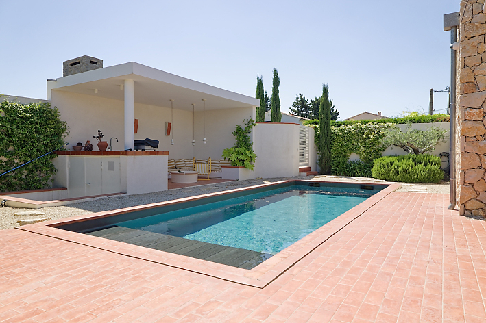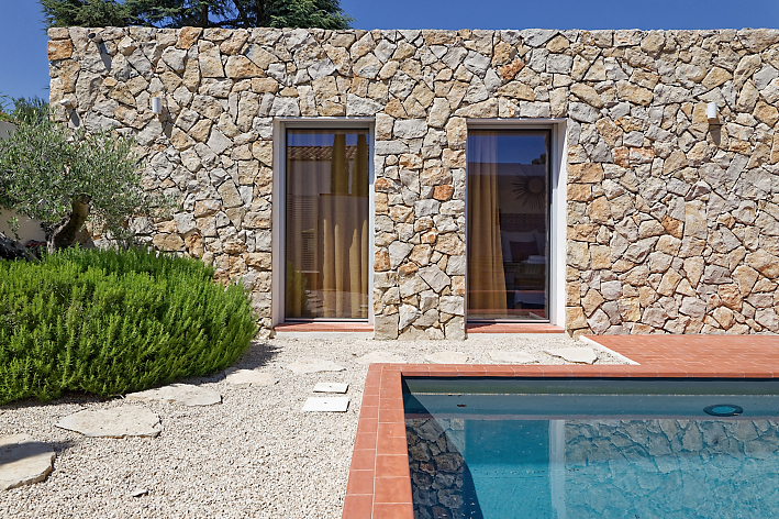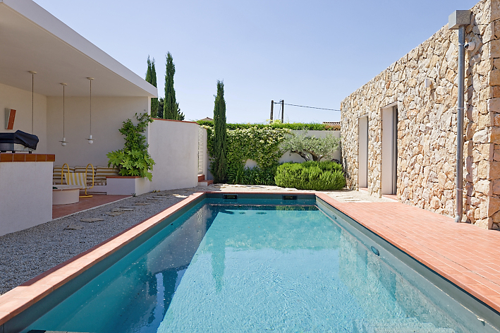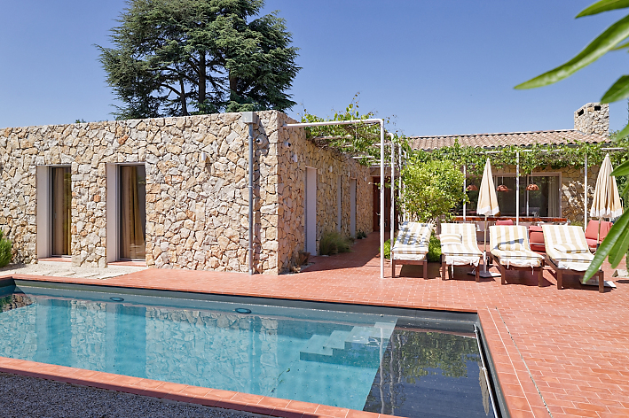 Mur de pierre, Pool house / Cuisine d’été, En village, Piscine traditionnelle, Terrasse carrelée / pierre, Terrasse couverte / pergola