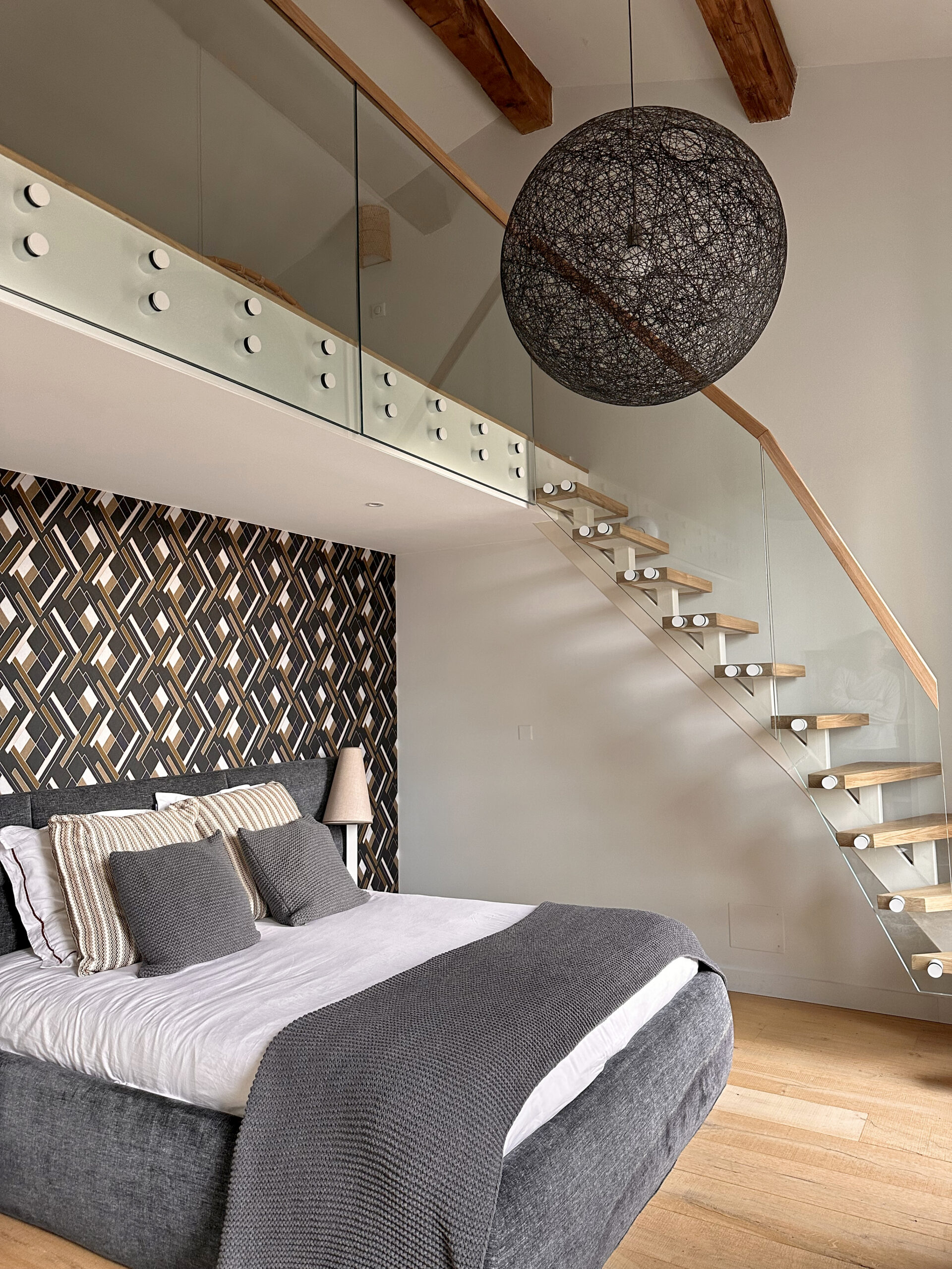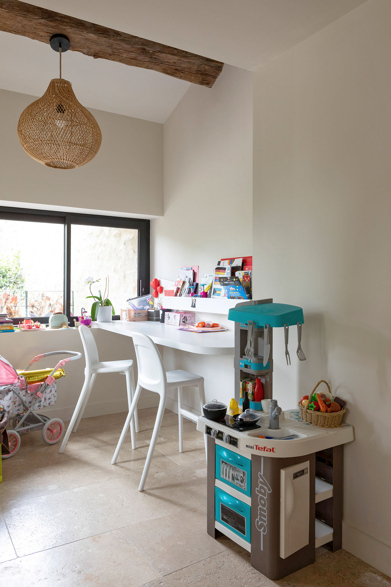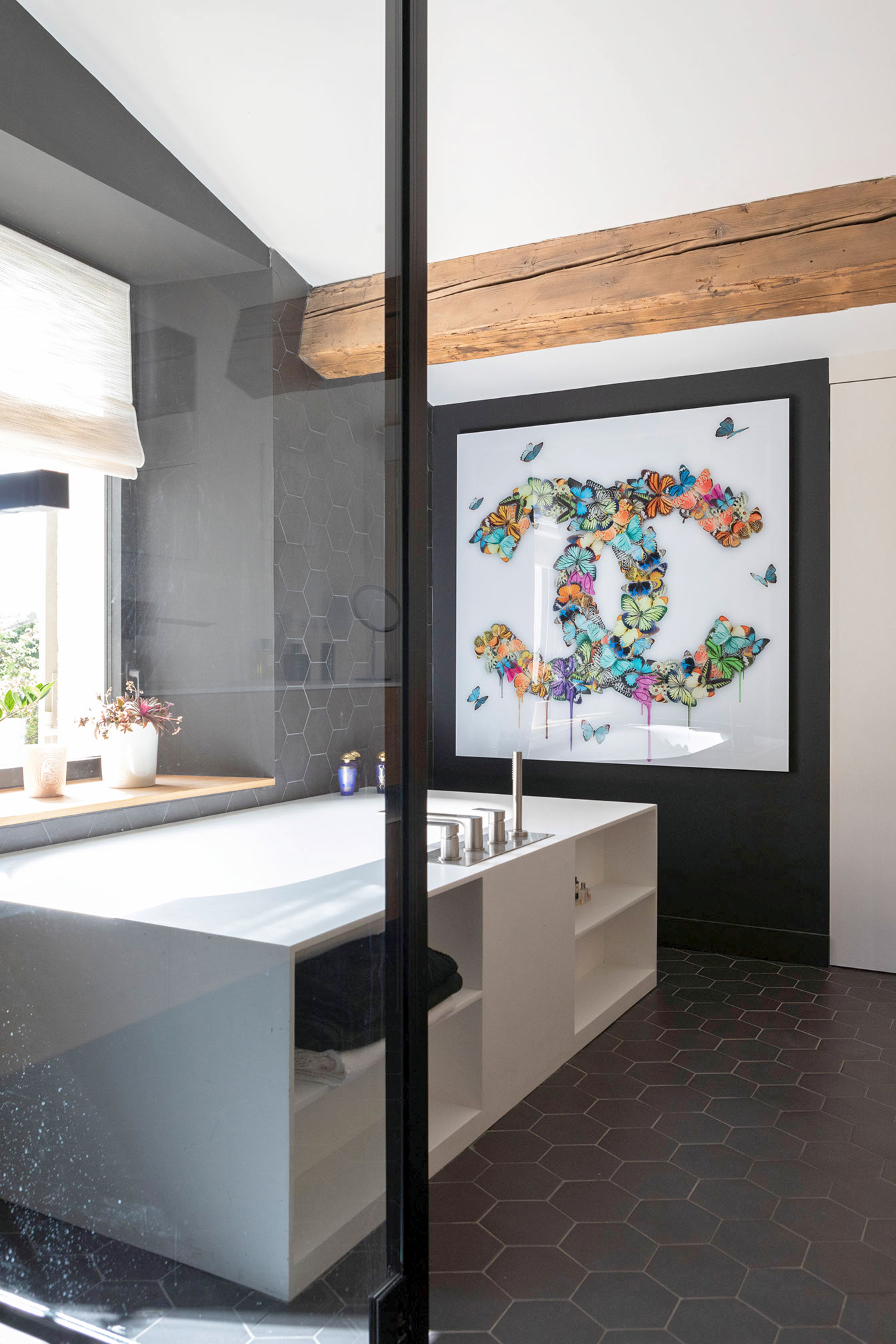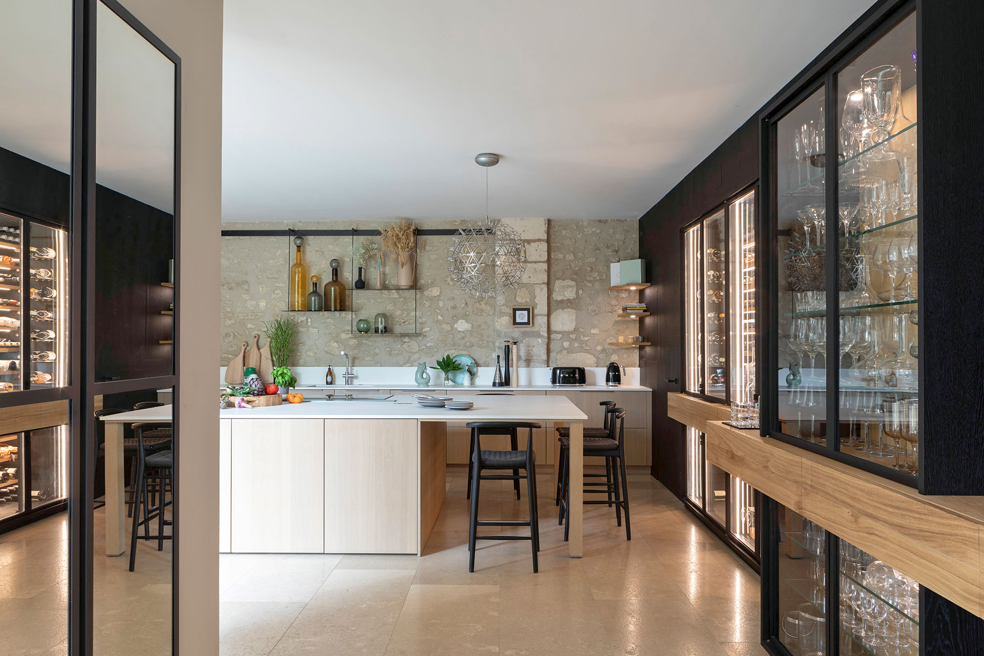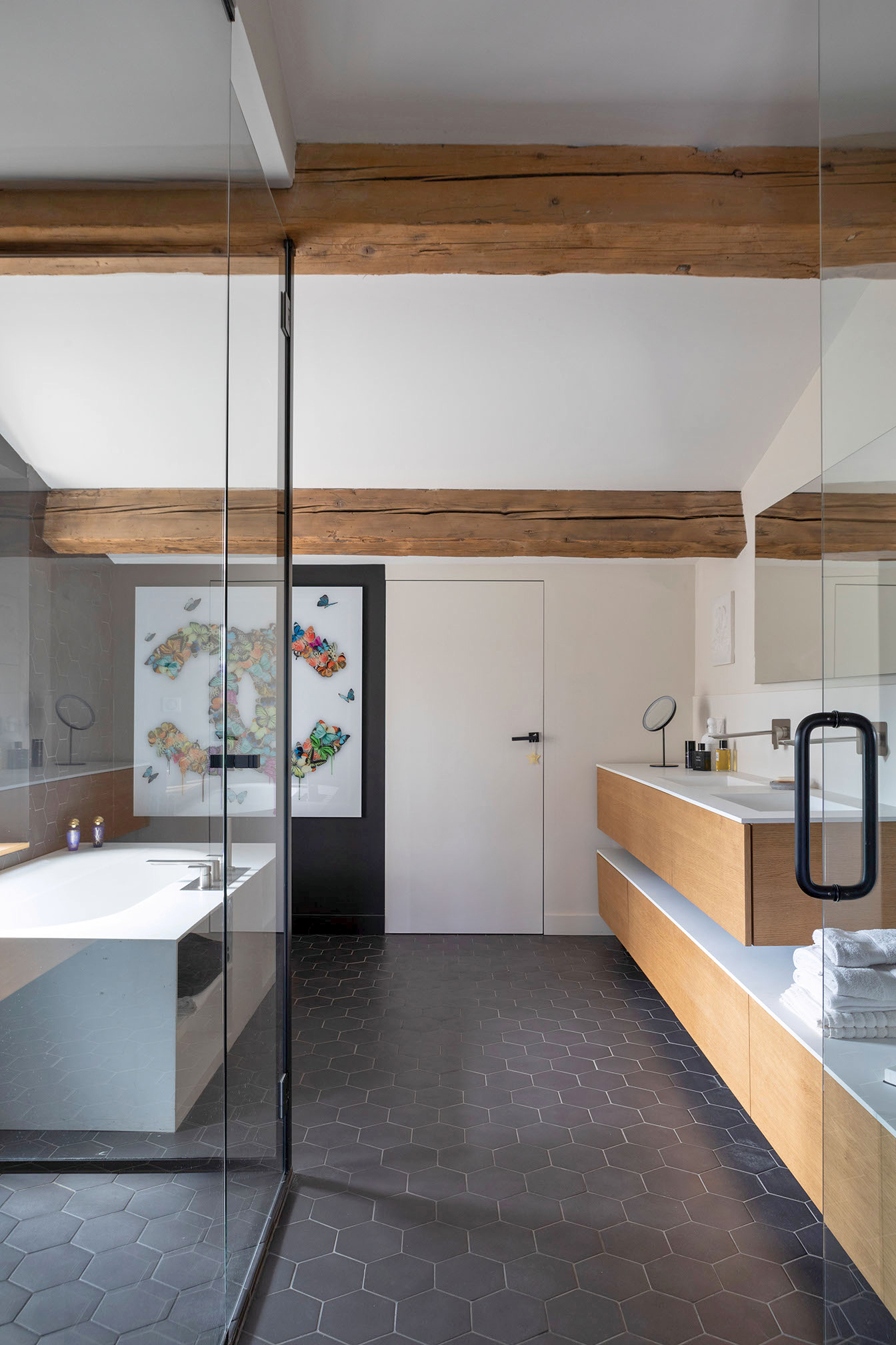 Ambiance classique, Grande hauteur sous plafond, Verrière / baie vitrée, Pierre apparente, Sol bois / parquet, Murs blancs / Enduits naturels, Tomettes / carrelage ancien, Cheminée, Charpente / poutres apparente, Ambiance rustique