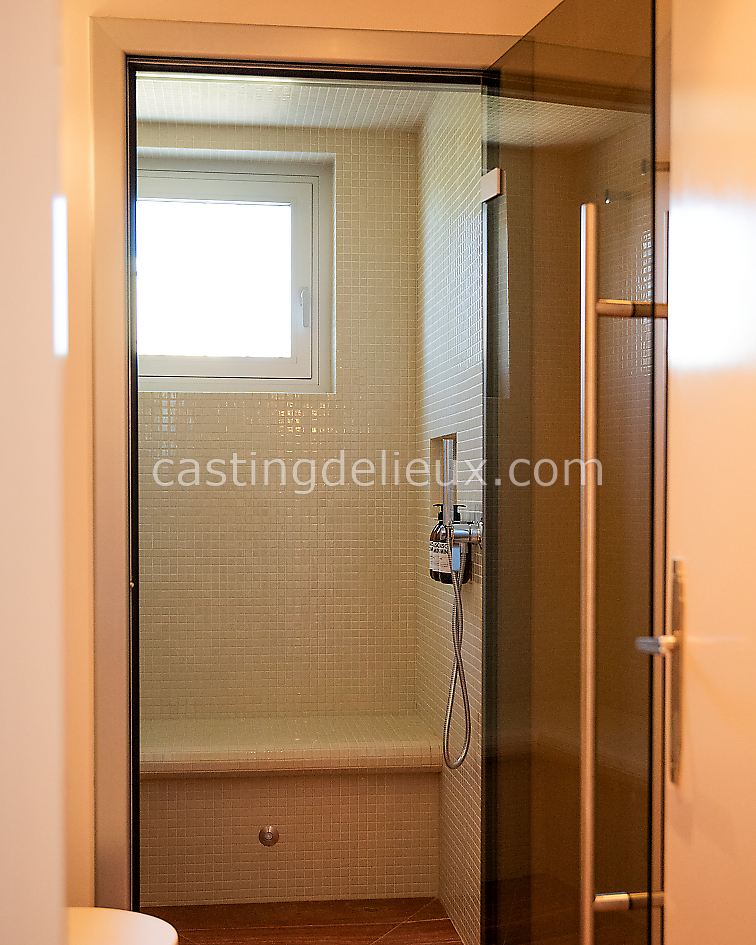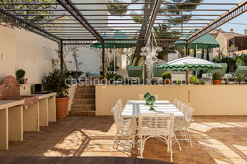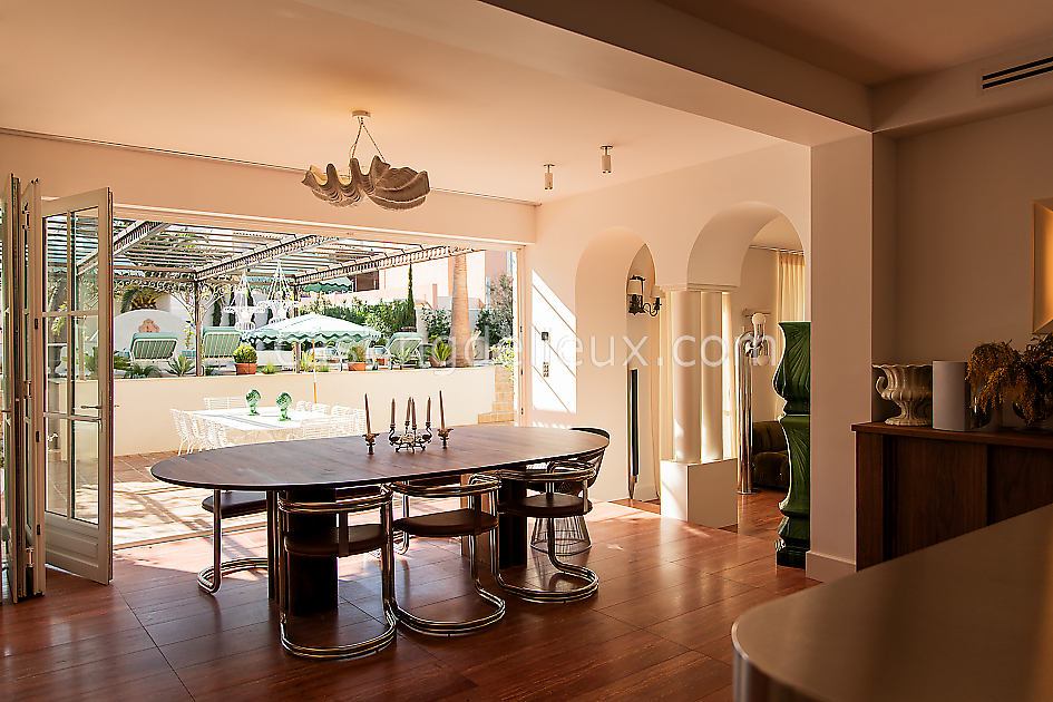 Quatre chambres en suite, deux salons, grande cuisine avec cheminée, piscine, spa avec sauna, hammam et salle de sport, toit-terrasse vue mer, cuisine d’été et accès direct à la Méditerranée.