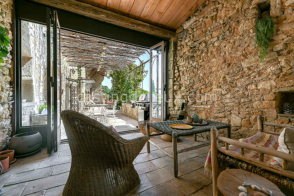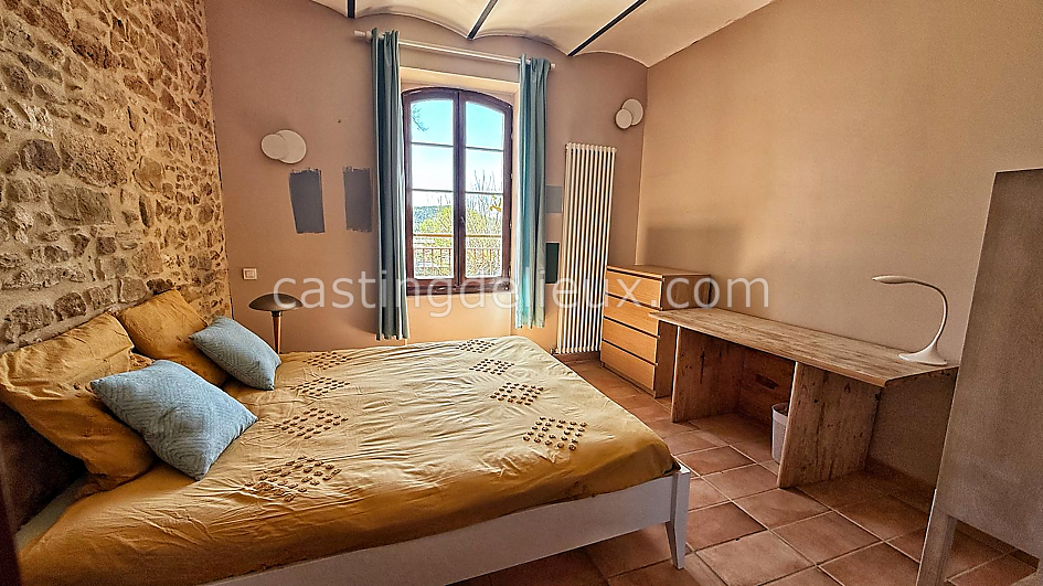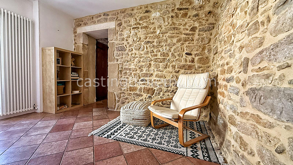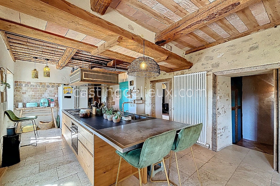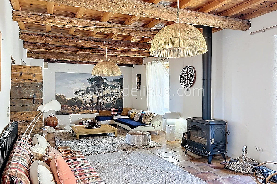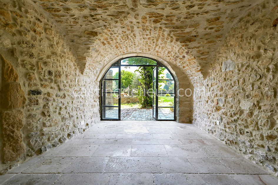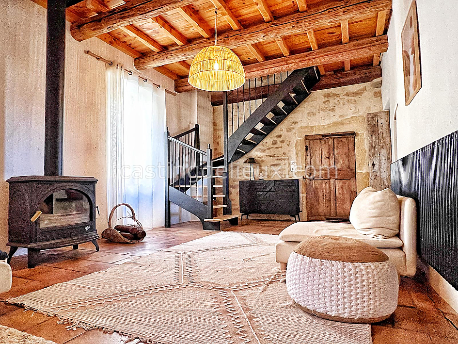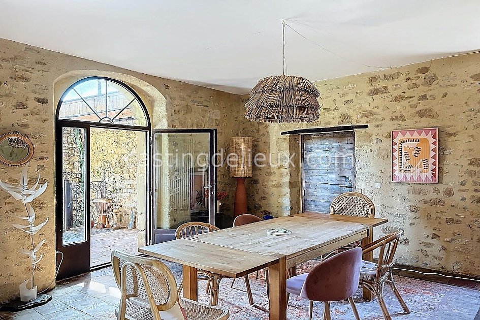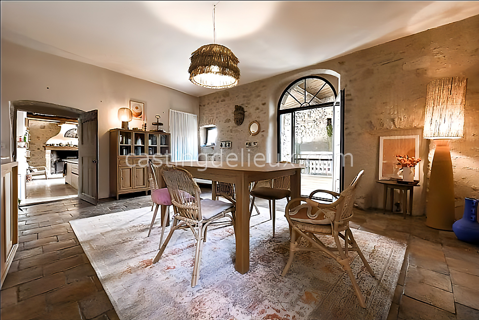 Grande hauteur sous plafond, Verrière / baie vitrée, Pierre apparente, Sol bois / parquet, Murs blancs / Enduits naturels, Tomettes / carrelage ancien, Cheminée, Charpente / poutres apparente